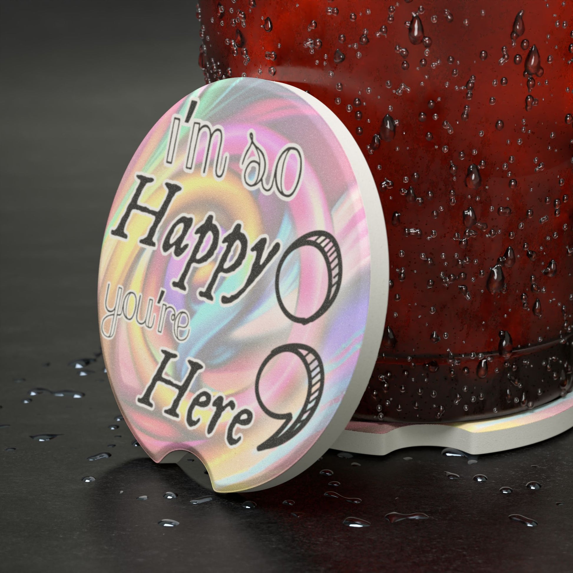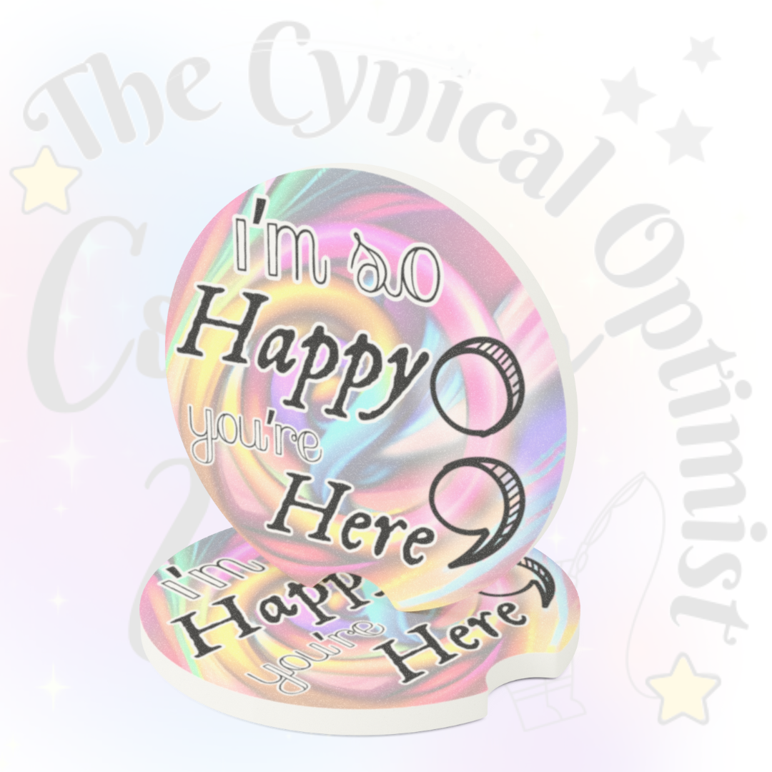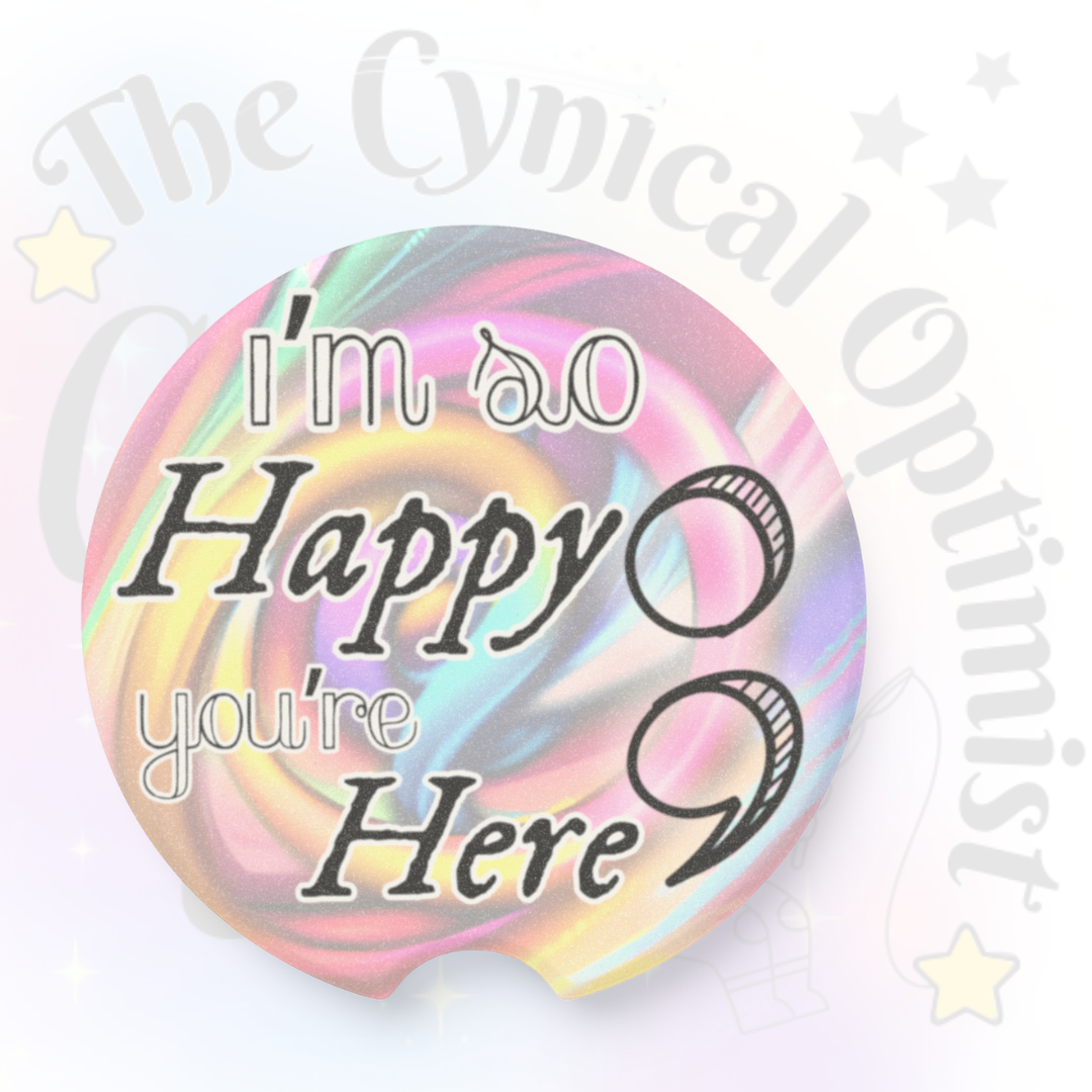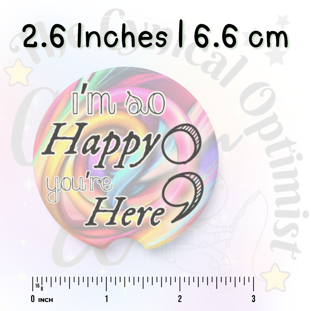 Absorbent soapstone car cup holder coaster with swirly pastel background. Typography states 'I'm so Happy You're Here'. A semicolon graphic sits to the side, a reference to the survivor symbol. This coaster gives off a welcoming and positive vibe, perfect for bringing a touch of happiness to your car. Ideal for those who enjoy thoughtful gestures and want to keep their cup holders clean and dry.