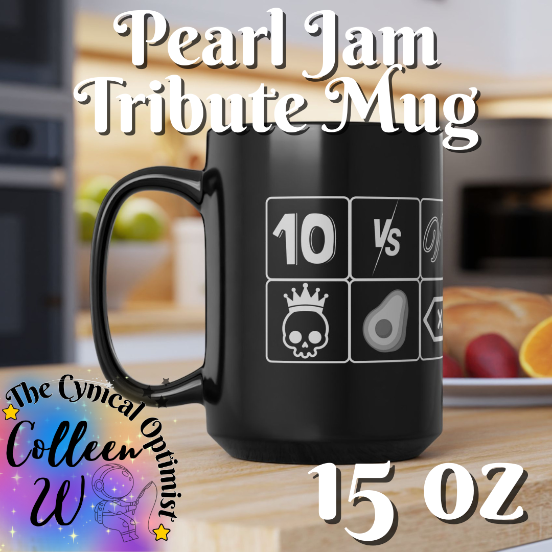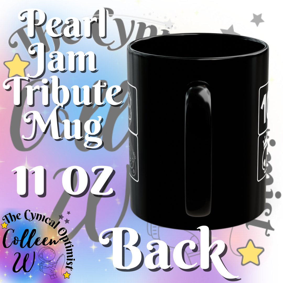 This sleek black ceramic mug features a grid of 12 colorful icons representing Pearl Jam's studio albums from the 90s era. The glossy black surface makes each album icon pop with vibrant color, turning your morning coffee into a personal listening session. Perfect for the fan who reads liner notes, remembers the first time a chorus hit, and appreciates the journey through one of grunge's most iconic discographies.