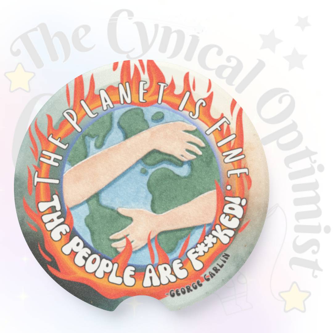 This soapstone car coaster carries a bold, hand-drawn message: a globe embraced by outstretched arms, ringed by flames and the blunt line “The planet is fine. The people are f***ed.” It feels like a small, defiant talisman for daily drives — a reminder to stay awake to the climate crisis while reaching for your coffee. The matte, one-sided print keeps the artwork vivid without glare, and the coaster’s natural stone surface quietly soaks up condensation so your cup holder stays dry. Sized to slip into most vehicle drink holders, it’s available as a single coaster or in coordinated sets so every driver in the car can have the same statement piece.