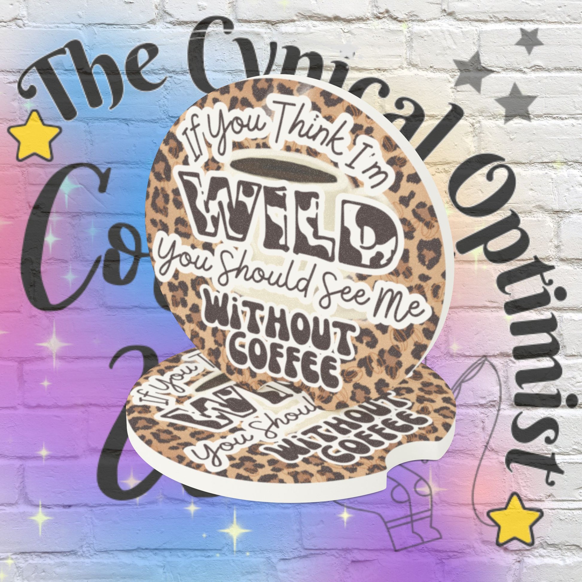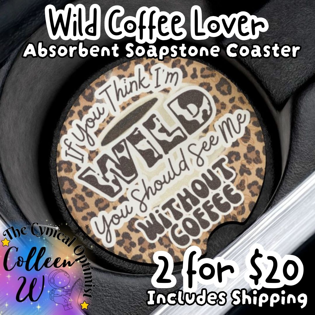 Introducing our stylish and practical absorbent soapstone coaster, perfect for your car or bar. Featuring a fierce cheetah print background, this coaster is not only eye-catching but also does a great job protecting your surfaces. With the witty quote If You Think I'm Wild, You Should See Me Without Coffee in bold, stylized lettering, this coaster adds a touch of fun to your decor. Grab one now and enjoy your drinks in wild style! Crafted from highly durable and absorbent soapstone, these car coasters blend custom looks and functionality in one neat package for every car. This must-have car accessory absorbs all moisture from your cold or hot en-route drinks and looks perfect in any car interior. Choose between 1pc or 2pcs to match your commuting needs. .: Material: 100% soapstone .: Size: 2.6″ × 2.6″ (6.6cm × 6.6cm) .: Available as a set of 2 .: Absorbs condensation .: One-sided print .: Matte finish .: Removable “Made in China” sticker on the bottom .: Please note: The coaster fits in MOST vehicle drink holders